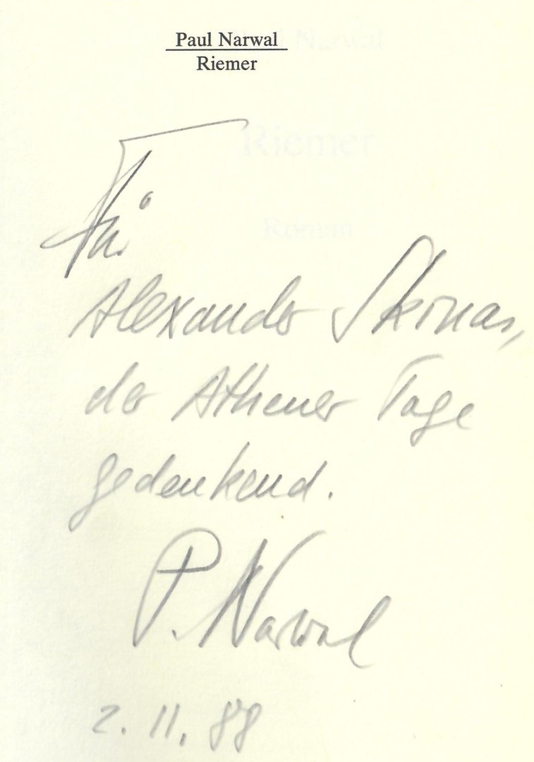 Meine künstlerische Entwicklung verdanke ich zu einem großen Teil bestimmten Personen, die mir durch persönlichen Zuspruch, vor allem aber durch ihr Können Mut und Hoffnung gegeben haben. Ich möchte nennen Monsieur P. L. Larcher, einstiger Verweser der Marcel Proust-Gesellschaft in Illier, Peter Weise, Dieter Wellershoff, Helmut Kindler, Roman Ritter, Johann P. Tammen.
